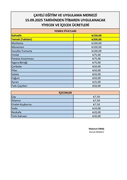 15.09.2025 Tarihinden itibaren geçerli yiyecek ve içecek fiyat listesi ekteki görselde sunulmuştur.